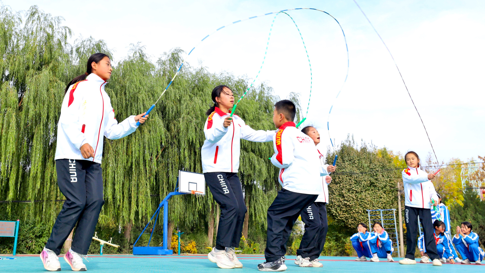 கன்சு மாகாணத்தில் ஓய்வு நேரத்தில் கயிறு தாவும் பயிற்சி செய்யும் மாணவர்கள்