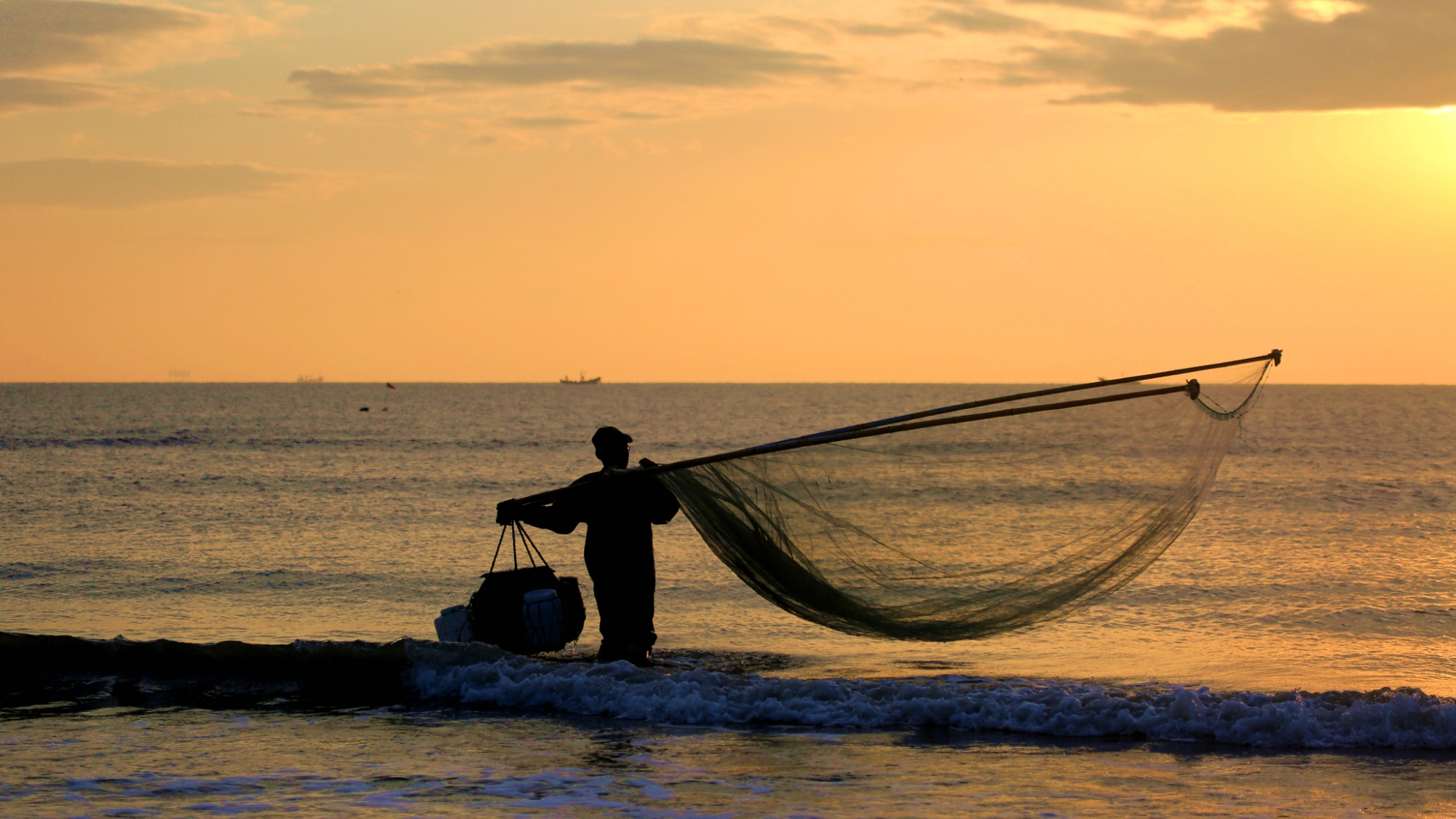 சூரிய அஸ்தமனத்தில் இறால்களைப் பிடிக்கும் மீனவர்கள்