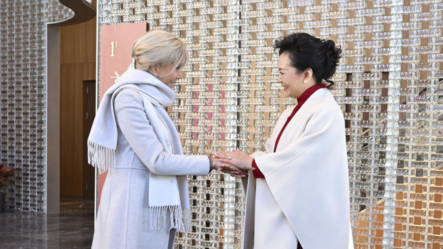பெய்ஜிங் மக்கள் கலை அரங்கத்தை சீன-பிரெஞ்சு அரசுத் தலைவர்களின் மனைவிகள் பார்வையிட்டனர்