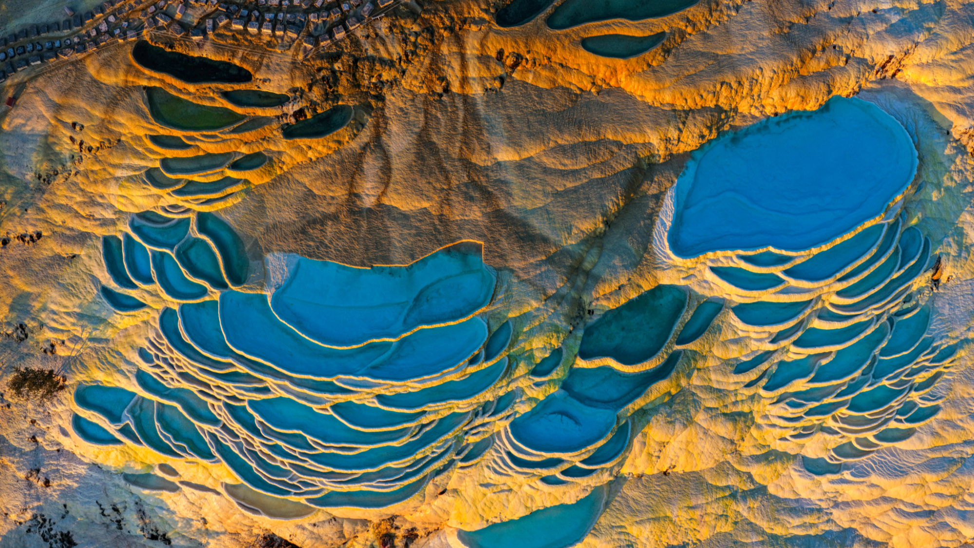 படிமுறை வயல்களை போன்ற நிலப்பரப்பில் சூரிய உதயம் ஒளிரும் காட்சி